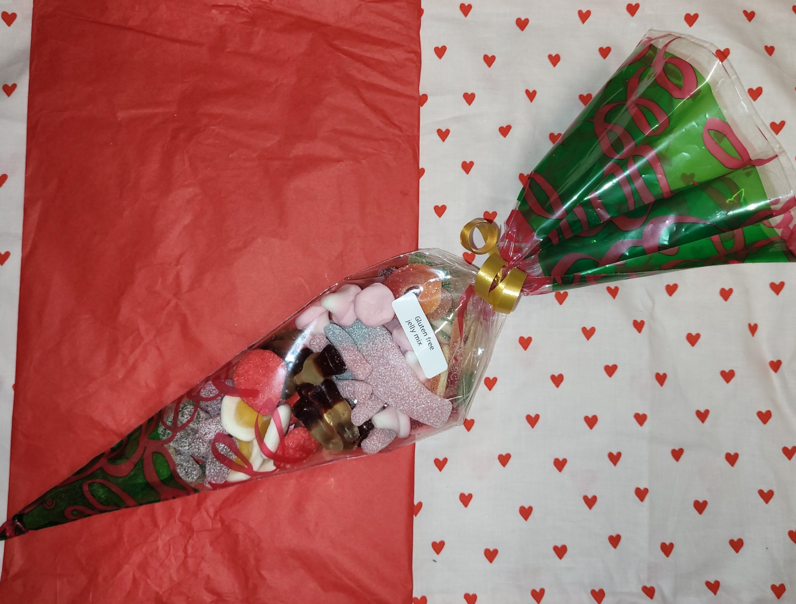A large cone bag filled with a mix of plain & fizzy gluten-free jellies.