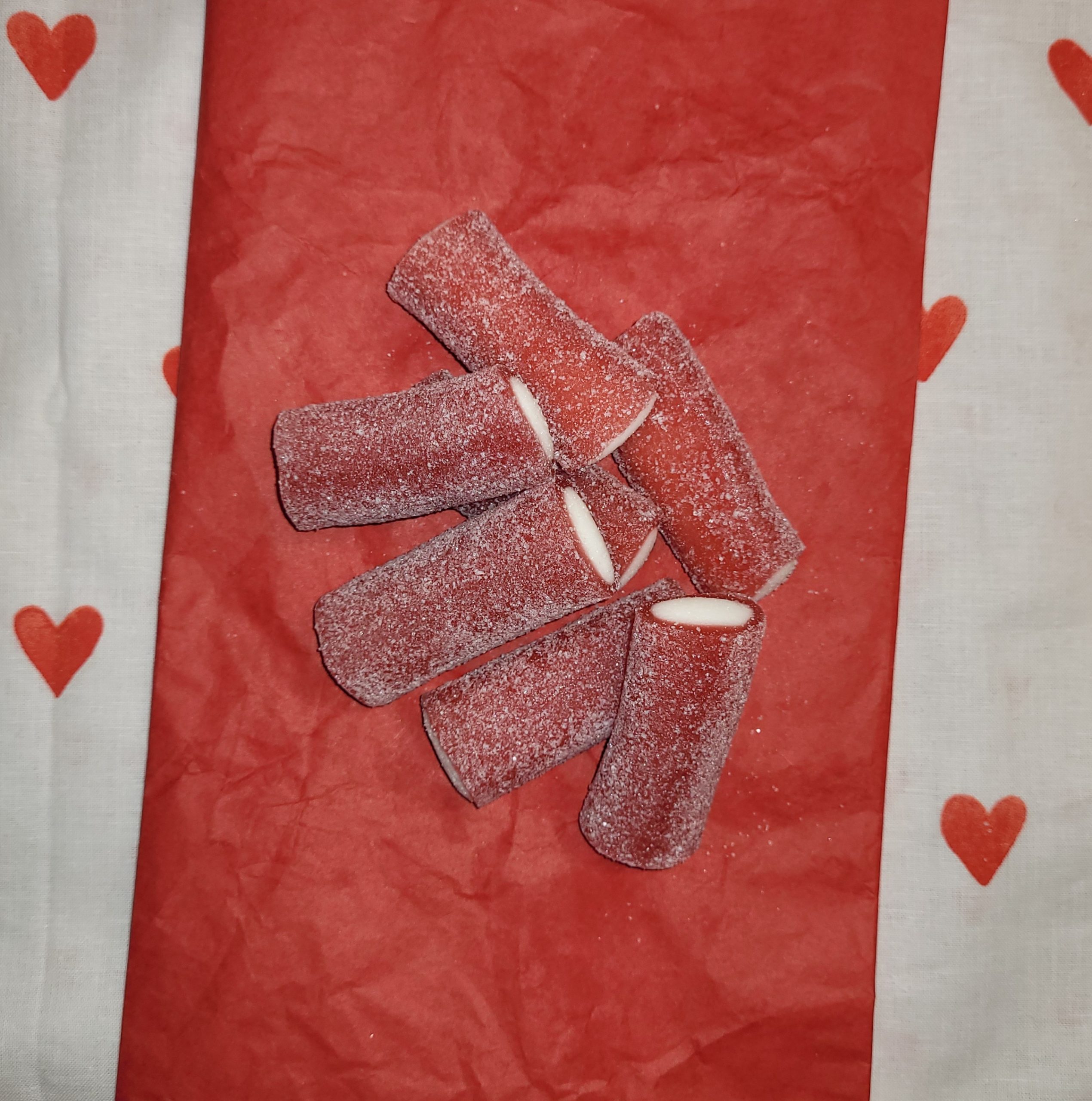 Fondant filled fizzy strawberry pencils.